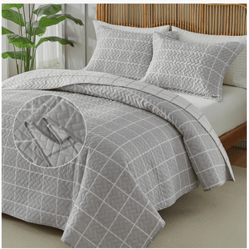 Kit Colcha Casal 3 Peças Itália 150 Fios Grid Dupla Face Cor Cinza